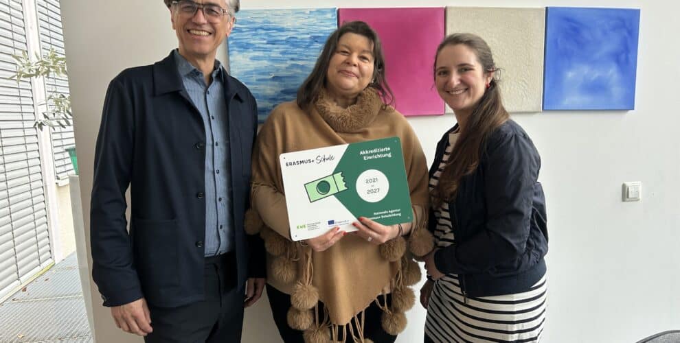Erasmus+ ist das Förderprogramm der Europäischen Union für allgemeine und berufliche Bildung. Es eröffnet Schulen europaweit neue Möglichkeiten für Austausche, Hospitationen und internationale Erfahrungen. Mit großem Engagement und viel Ausdauer haben Frau Bacher und Frau von Dessien in diesem Schuljahr den äußerst aufwändigen Antrag vorbereitet und