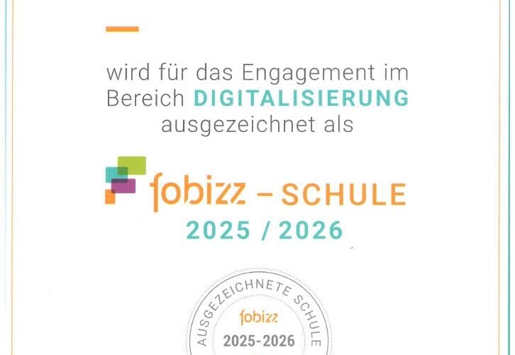 Schon zum 2. Mal wurde unsere Schule von fobizz, einem Tool für digitale Anwendungen, unter anderem auch für künstliche Intelligenz, ausgezeichnet. Wir freuen uns über die Anerkennung.