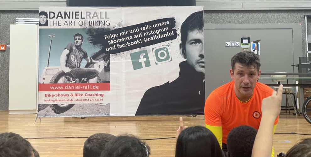 Ein Aktionstag des Innenministeriums Baden-Württemberg, gesponsert von der Volksbank Zuffenhausen, zur Bedeutung des Fahrradhelms, um sein Bestes, nämlich den Kopf, zu schützen, kam bei den Schülerinnen und Schülern der Klassen 5 – 7 sehr gut an. Eine Bikeshow von Daniel Rall, einem bekannten Trialfahrer, Mitmachaktionen