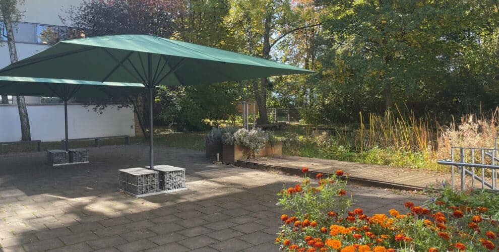 Zwar naht der Winter, doch die sonnigen Herbsttage ermöglichten es uns, uns an den neuen Großschirmen zu erfreuen, die wir dank einer großzügigen Spende finanzieren konnten. Klimawandel und die Freude der Schülerschaft an Schutz und Geborgenheit im Grünen beim Biotop waren der Grund, warum wir