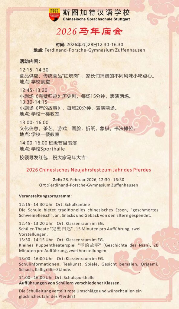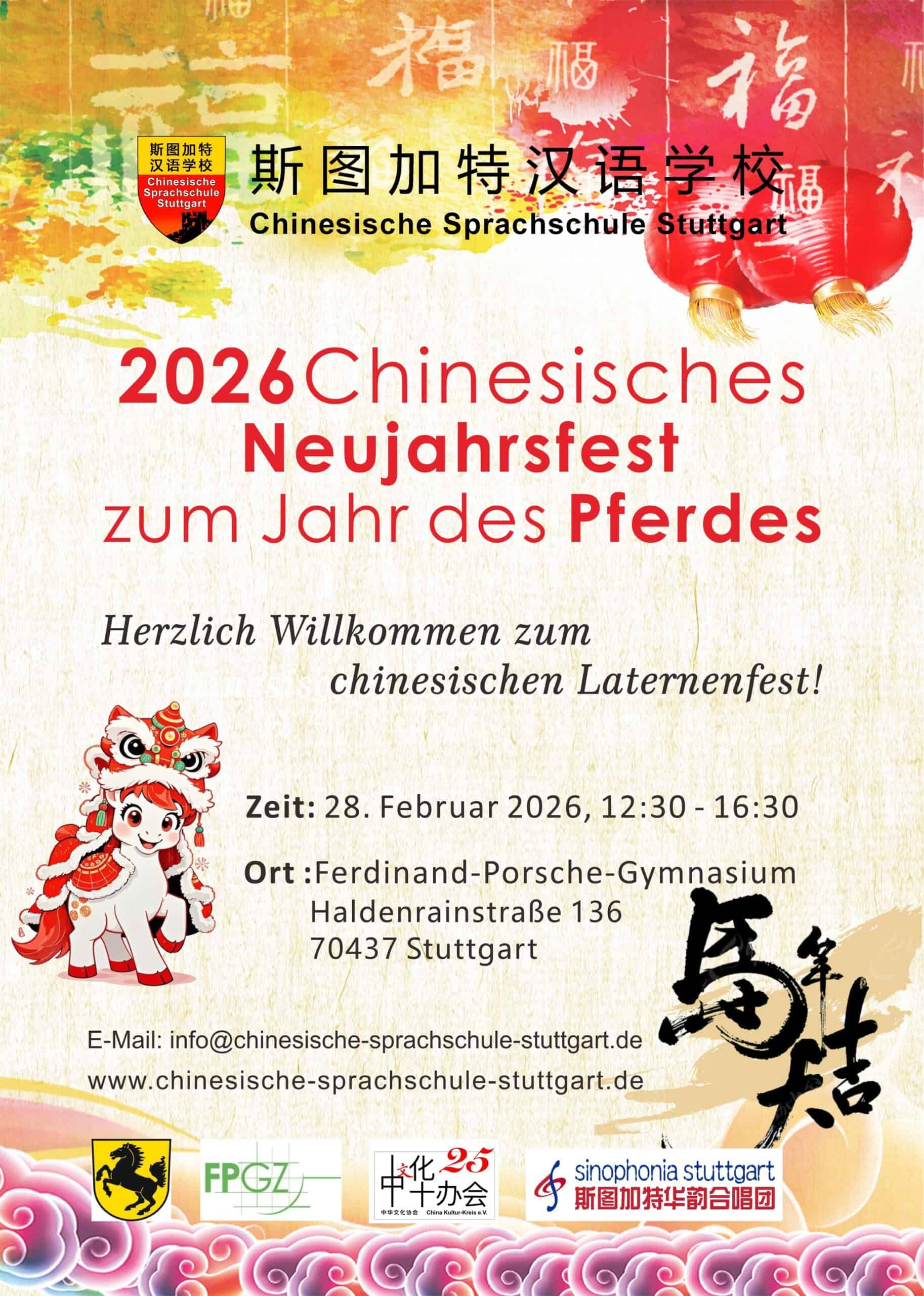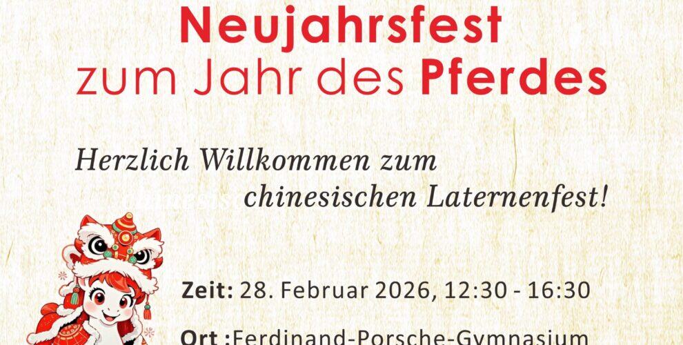 Die chinesische Sprachschule Stuttgart (https://chinesische-sprachschule-stuttgart.de/de_de/) ist jeden Samstag Gast am Ferdinand-Porsche-Gymnasium. Zum diesjährigen Neujahrsfest zum Jahr des Pferdes lädt die Schule alle Interessierten ein.