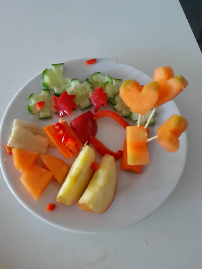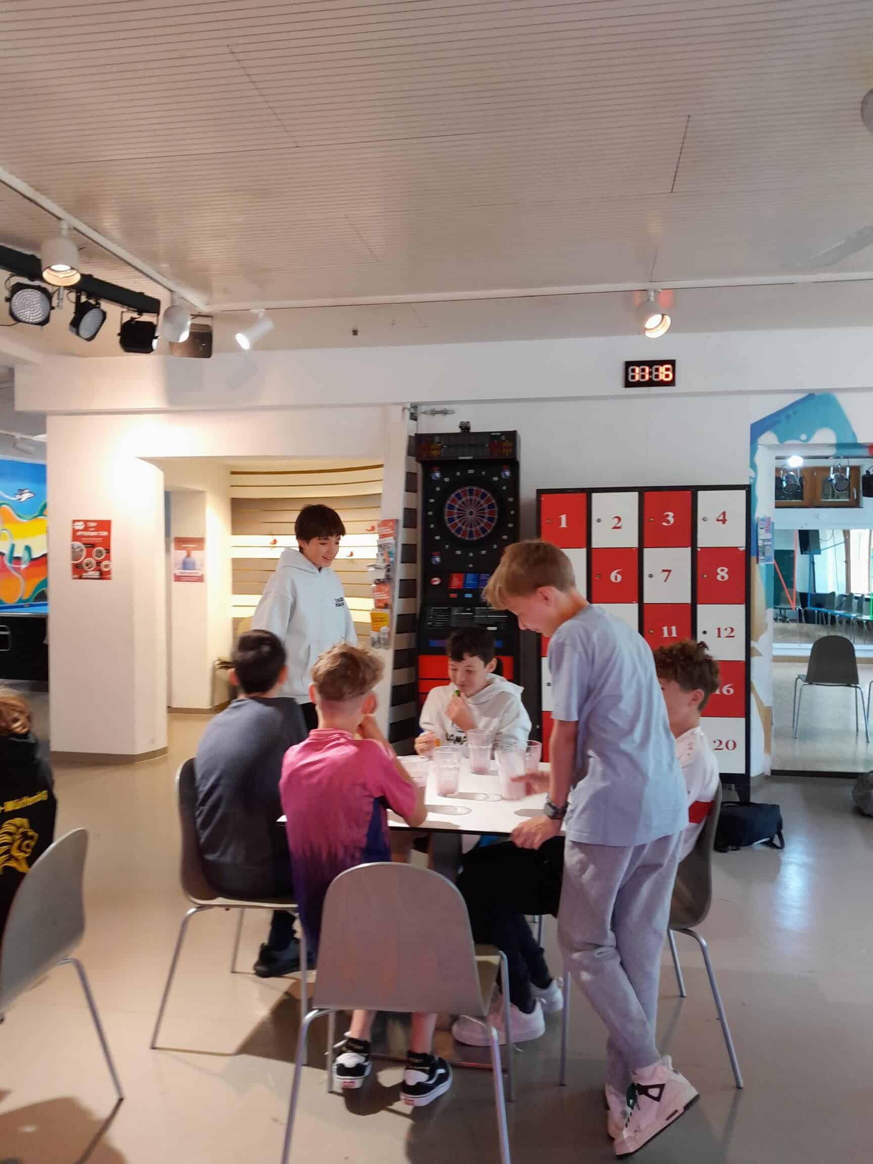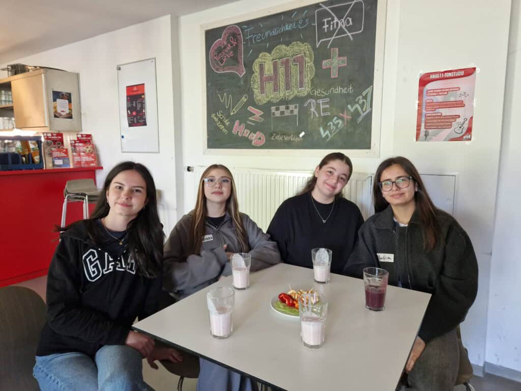 Neben Anregungen zum Umgang mit Stress, der Aufgabe in Gruppen Menschenpyramiden zu erstellen, haben die SuS Überlegungen zu einem selbstständigen, achtsamen Umgang mit ungesunden, oft versteckten Zuckern in Lebensmitteln angestellt. Danach hatten die SuS viel Spaß im Cafebereich des Jugendhauses bei der Herstellung von Obst- und Gemüsetellern zum direkten Verzehr und dem Genuss eines Smoothies.