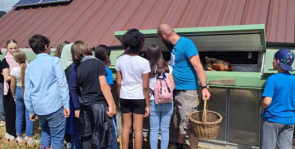 Endlich durften wir zu den Tieren, an denen wir schon auf dem Hinweg vorbeigekommen waren: Viele von uns haben eifrig beim Stallausmisten geholfen. Die Kühe grasten und tollten auf der Weide. In das Gemeinschaftsgehege von Hühnern und Ziegen konnten wir hineingehen und dort die Tiere streicheln und füttern. Viele von uns haben zum ersten Mal erlebt, wie ein Huhn ein Ei legt!