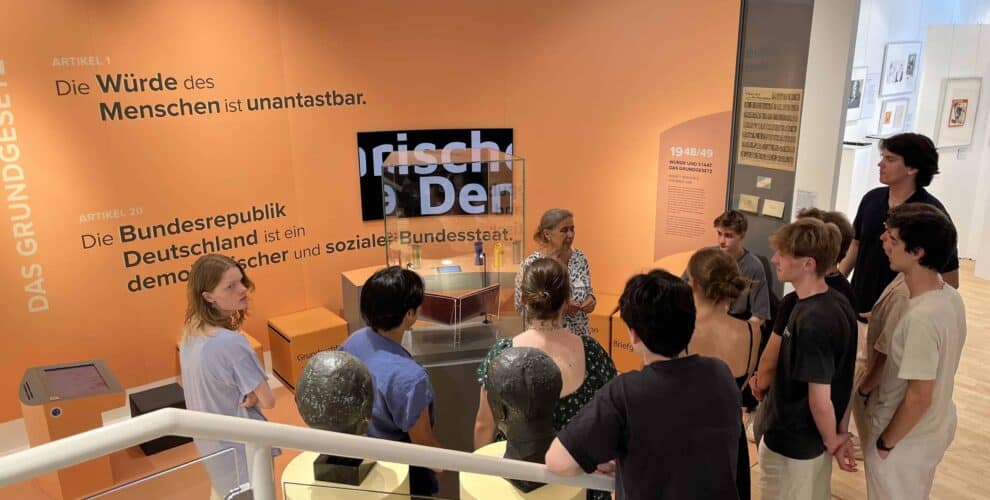 In einer der letzten GK-Leistungskursstunden besuchten wir das Theodor-Heuss-Haus am Killesberg. Dabei konnten wir nicht nur drei ehemaligen Wohnräume des ersten Bundespräsidenten der BRD besichtigen, sondern erfuhren in einer Führung auch, welche besondere Rolle er und seine Frau in fünf Epochen deutscher Geschichte spielten. Besonders interessant war für uns GKler dabei neben den Aspekten zur “Demokratie als Lebensform” vor allem auch der interaktiv gestaltete Part der Ausstellung „Die Nr. 1 – das Staatsoberhaupt“, das die Funktion und Aufgabe eines Bundespräsidenten und der First Lady anschaulich vor Augen führte.