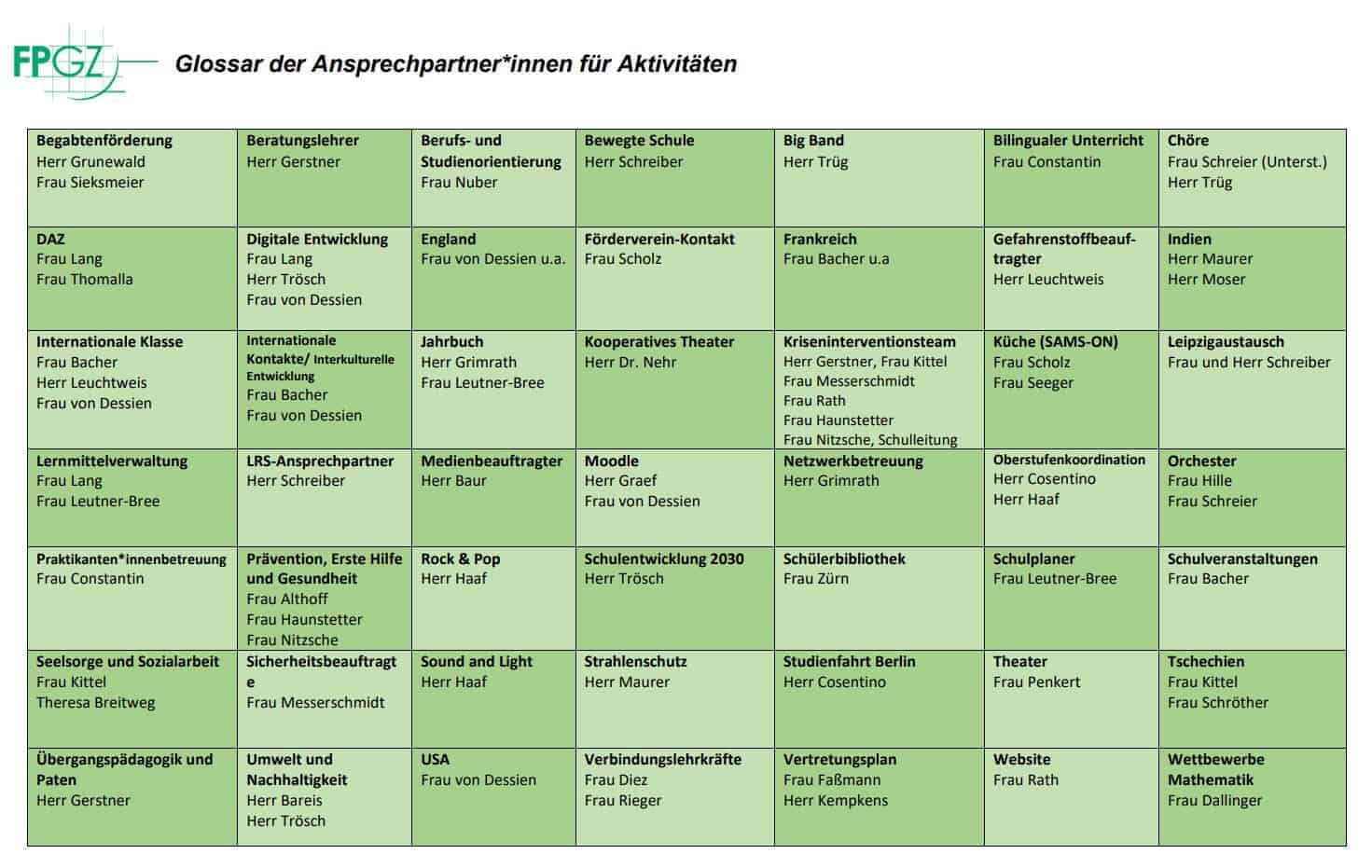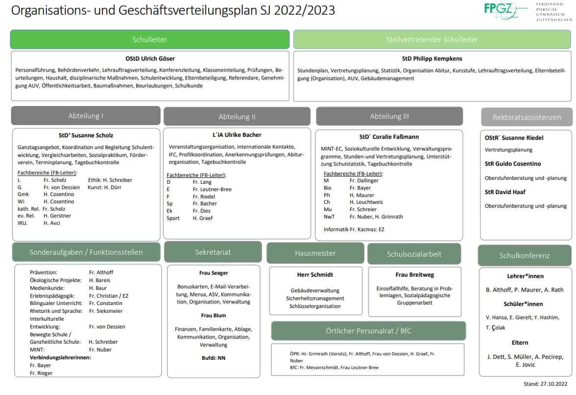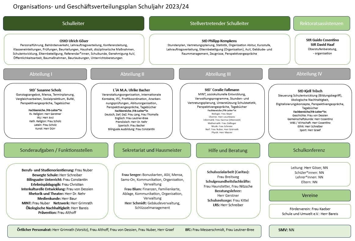 Hier findet ihr den Organisations- und Geschäftsverteilungsplan sowie das Glossar der Ansprechpartner*innen für Aktivitäten im jeweils aktuellen Schuljahr. Einfach das Akkordeon öffnen und auf die Grafik klicken um es in voller Größe zu sehen.